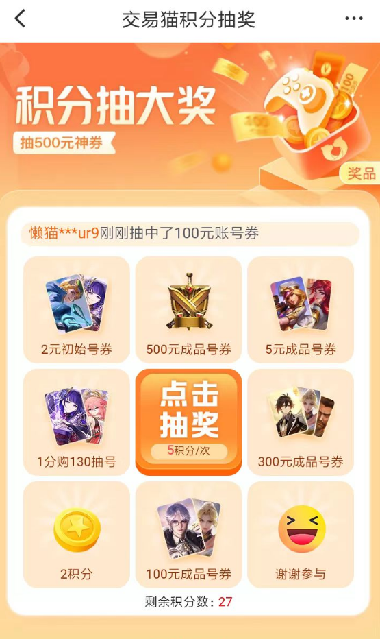 3、想要享受平臺優(yōu)惠政策的玩家,也可以直接去參與積分簽到的任務,每天積累的大量積分可以直接用于抽獎活動當中。部分玩家可以在抽獎活動內(nèi)得到不同類型的消費券,以此購買到價格更實惠的游戲賬號。