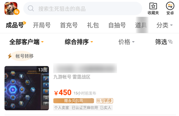 打開交易貓軟件之后我們直接搜索名稱來到對應專區(qū),這里需要注意這款游戲分為端游版和手游版,賬號是不互通的,要根據自己的實際情況來選擇。進入專區(qū)后映入眼簾的就是大量的優(yōu)質賬號,我們可以看到平臺本身就給這些賬號進行了分類,生死狙擊這款游戲主要是首充號、開局號、自抽號以及成品號這四個類別,對于一般玩家而言,選擇成品號就可以了。在商品列表的這個界面中我們不僅可以看到賬號的簡單介紹以及價格,還能夠直觀看到賬號以及服務器版本,更是可以直接查看其帶有的平臺服務。