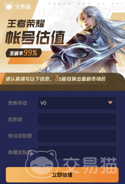 大家在首頁(yè)搜估值二字就會(huì)馬上跳轉(zhuǎn)到賬號(hào)價(jià)值評(píng)估的相關(guān)頁(yè)面,然后根據(jù)提示輸入自己的賬號(hào)信息即可。交易貓能自動(dòng)在3秒時(shí)間里為你報(bào)出市場(chǎng)價(jià),準(zhǔn)確率高達(dá)百分之99哦,而且還是免費(fèi)的!