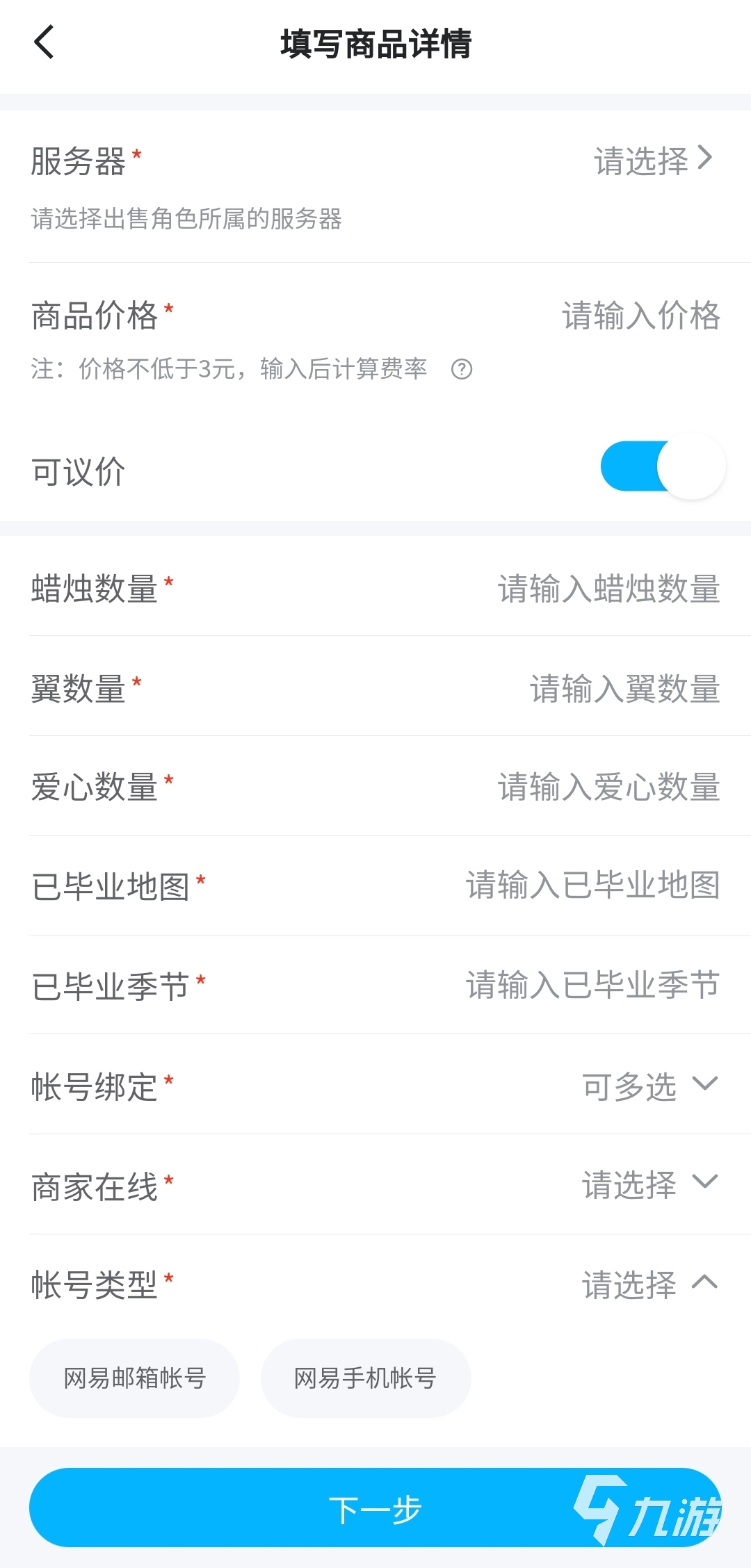 發(fā)布賬號的方式很簡單,各位進入“我要賣”中,找到想要賣號的那款游戲,大家也無需苦惱該怎么描述賬號狀況,平臺已經(jīng)提供了模板,賣家填好相應的信息就行了。發(fā)布后,商品詳情頁中會清晰排列好比如蠟燭數(shù)量、翼數(shù)量、愛心數(shù)量、已畢業(yè)地圖、已畢業(yè)季節(jié)等。