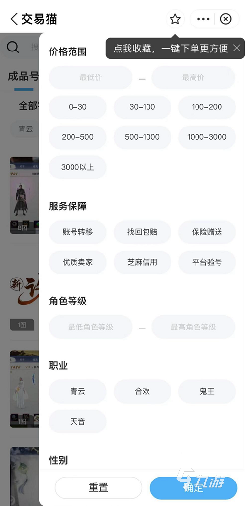 然后給小伙伴介紹,如何找到自己喜歡的游戲賬號(hào),看過(guò)之后就知道交易貓有多強(qiáng)大,多方便了,在搜索游戲名稱之后會(huì)出來(lái)非常多的相關(guān)信息,有賬號(hào),有一些道具還有禮包之類的,在買號(hào)的同時(shí),說(shuō)不準(zhǔn)還可以找到一些限量或者絕版的道具之類的,然后,可以在旁邊看到篩選按鈕,篩選選項(xiàng)也是非常多樣,可以快速精準(zhǔn)的找到自己喜歡的賬號(hào),包括職業(yè)、角色等級(jí),甚至還有性別,真的是非常詳細(xì)。