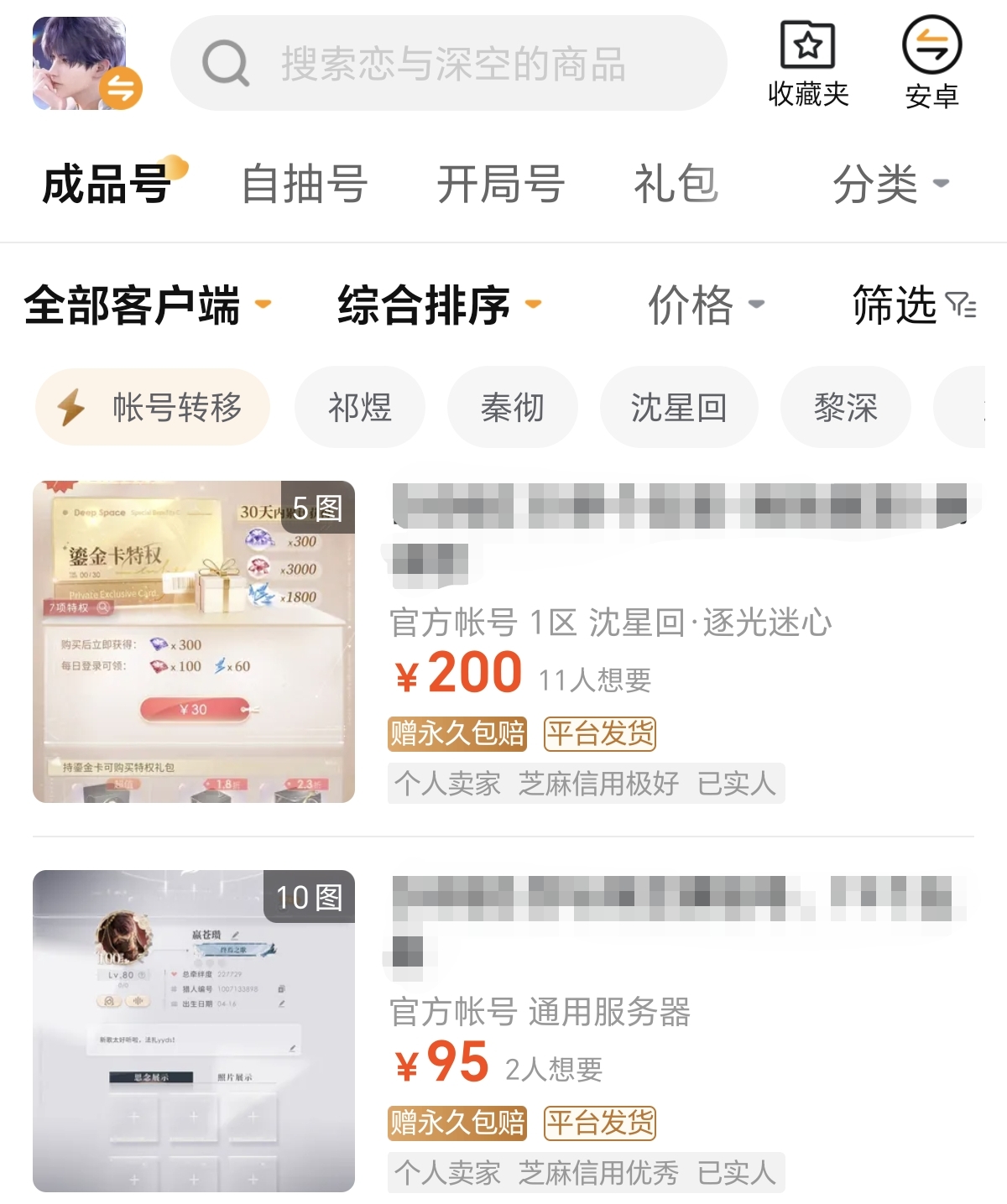 在交易貓平臺上,你不僅可以購買成品號,還可以選擇豪華賬號、初始賬號等多種類型。要找到適合的游戲賬號,首先需要進入相應游戲的專區(qū),然后瀏覽其中的賬號信息。例如,購買戀與深空的游戲賬號也是如此。在搜索后,你會看到許多賬號商品,查看它們的詳細信息,如等級和資源等,然后根據自己的需求選擇最合適的賬號。