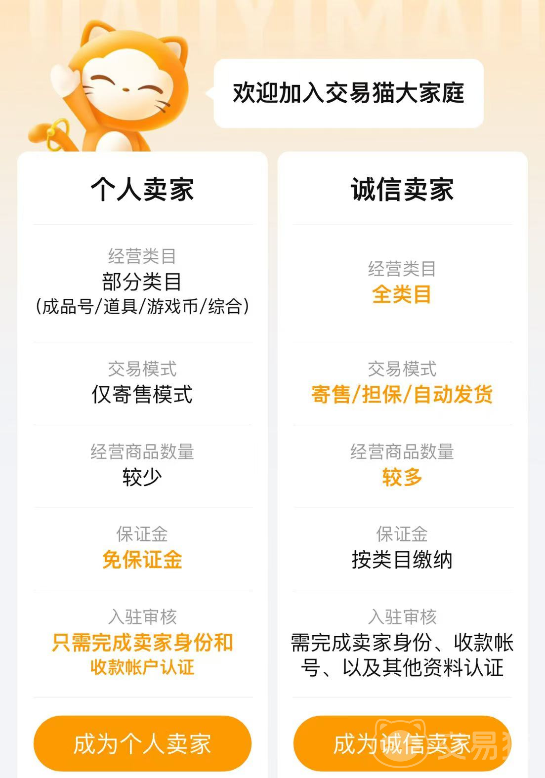 首先交易貓支持所有用戶都來成為賣家出售商品,其中個人賣家不需要門檻,認證了賣家身份及收款賬戶以后就能出售。有條件的小伙伴也可以選擇成為誠信賣家,只要按要求繳納相應的保證金以后就能經(jīng)營全類目,而且還能選擇自動發(fā)貨、擔保、寄售多種交易模式,十分人性化。