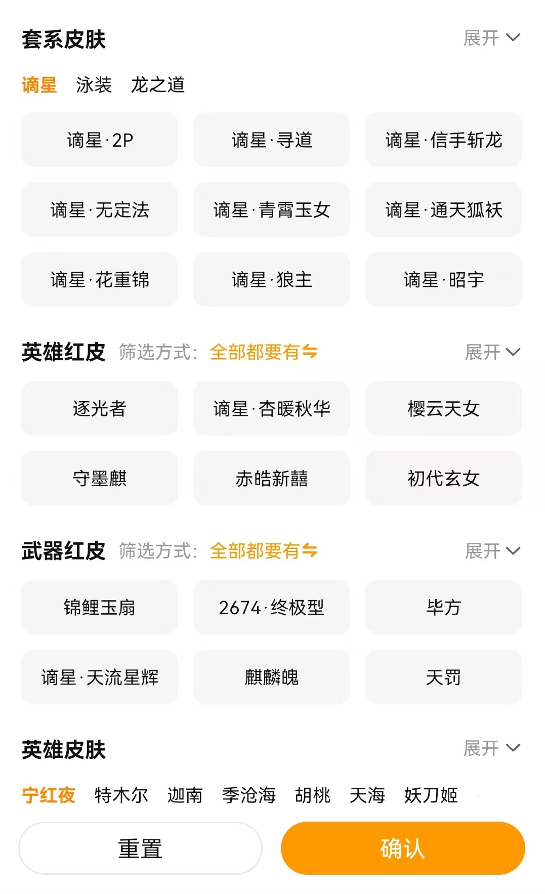 而且在商品展現(xiàn)方面,biubiu也有自己的特點(diǎn),通過篩選功能可以直接進(jìn)行套系皮膚、英雄紅皮、武器紅皮、和英雄皮膚等各個(gè)方面的點(diǎn)擊選擇,直接篩選出來,就能找到最適合自己的游戲號。雖然交易貓中上架的賬號數(shù)量非常多,但是有了這樣的模板和篩選功能,就能在海量商品中快速鎖定。上架時(shí)候也是如此,通過模板去點(diǎn)擊選擇,很輕松的就能達(dá)到目的。即使是沒有太多經(jīng)驗(yàn),也可以在這里很順暢地完成所有操作。