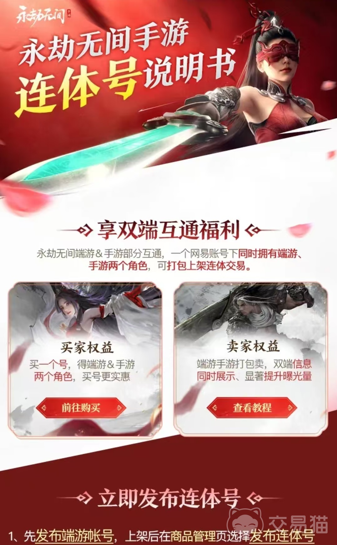 在交易貓中進(jìn)行這款游戲的賬號交易,最大的優(yōu)勢在于在這里可以直接發(fā)布連體號,連體號指的就是端游和手游一起打包進(jìn)行交易。如果想要進(jìn)行這樣的操作,首先在這里發(fā)布端游賬號,上架后通過商品管理頁去選擇發(fā)布連體號,進(jìn)而選擇同賬號下的手游角色,然后直接開始發(fā)布手游端連體號就可以了。這樣一個(gè)游戲賬號下的更多游戲資產(chǎn),都可以在商品詳情中全部展現(xiàn)出來,不僅大幅度提高了商品的價(jià)值,更是贏得玩家偏好?,F(xiàn)在很多買家都偏好于購買連體號,相信現(xiàn)在有這樣需求的用戶,也是有這樣的打算。這樣就可以一次購買解決很多問題。在連體號發(fā)布成功之后,雙端商品列表中均會顯示該商品。這樣也大大加快了出售的節(jié)奏。