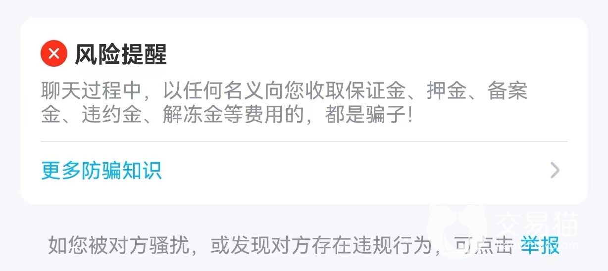 在交易貓平臺(tái)安全交易的前提就是,所有流程都在平臺(tái)內(nèi)進(jìn)行,一旦脫離了平臺(tái)就得不到安全保障,因此不論是買家還是賣家都需要記住這一點(diǎn)。新人交易可能沒(méi)有這個(gè)意識(shí),智能系統(tǒng)會(huì)發(fā)出提示,如果有引導(dǎo)前往其他渠道交易的意圖就會(huì)自動(dòng)彈出警告,以此幫助用戶提高警惕。