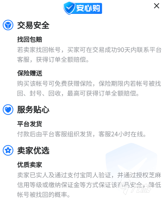 雖然是體驗服賬號,但如果碰到素質低下的賣家,還是有找回風險的,不過平臺專門為此推出了“安心購”服務,帶有該服務標識的賬號,有的可以享有“保險贈送”服務,讓您免費獲贈一份保險保障安全,還有的則是享有“找回包賠”,對于部分符合要求的特定商品,在期限時間內發(fā)生找回,可進行申訴理賠。當然,也有少數賬號會同時享有以上兩種服務。