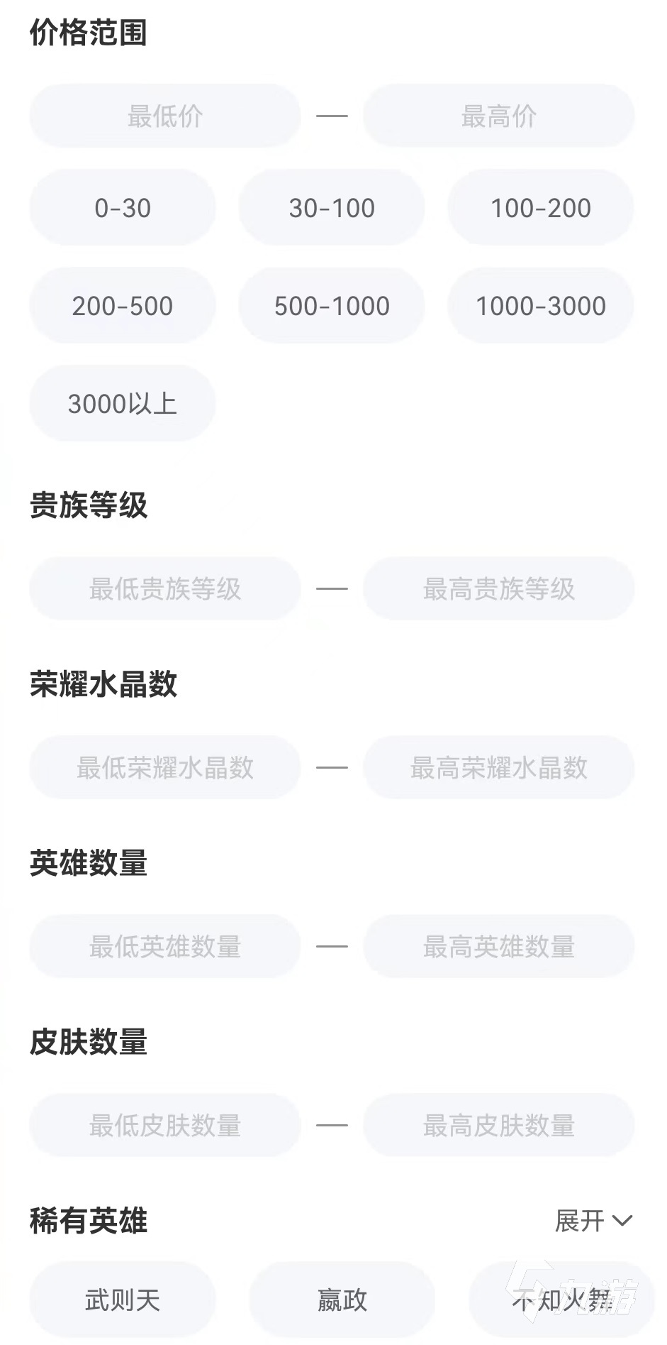 在王者專區(qū)中可以看到有非常龐大的賬號總量,為了將其中符合購買需求的選擇出來,可以在篩選中價格范圍里選擇1000元,如果沒有其他要求,那么找出來的就是所有該價位商品。如果對水晶數量,英雄數量和某些特定稀有皮膚有需求,在下方也可以全部點擊選擇出,這樣篩選出來商品更加詳細。