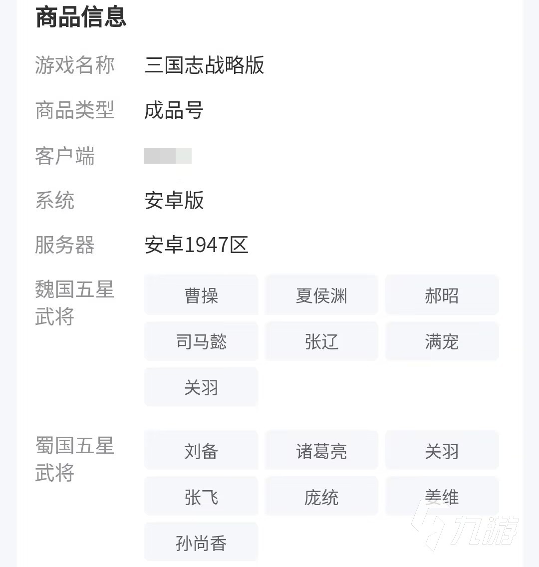 小米渠道的三國志戰(zhàn)略版玩家選擇交易貓賣號其實可以省掉很多的時間,比如在填寫自己的商品信息時,不需要繁瑣的文字一段一段的輸入,而是直接根據(jù)平臺所提供的模板依次輸入蜀國,吳國和群雄武將等等有哪些特色的五星英雄,也可以輸入自己在某個賽季中的排名和成就,這些都能大大的提高賣號的曝光率。