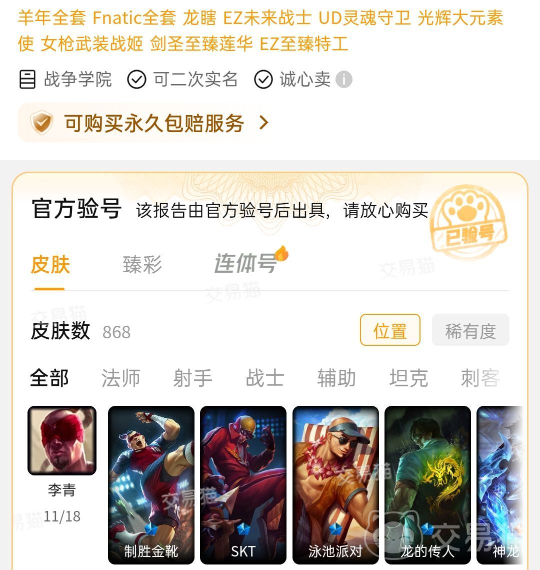 對(duì)買家來(lái)說(shuō)能夠以最快的時(shí)間對(duì)比相同價(jià)位的賬號(hào)商品是非常重要的,交易貓的英雄聯(lián)盟專區(qū)會(huì)非常突出的展示三個(gè)信息:所在區(qū)服、是否二次實(shí)名以及是否有誠(chéng)心賣標(biāo)簽。除此之外還將游戲內(nèi)六個(gè)位置的英雄和皮膚做出了分類,以便買家更加清晰的對(duì)比篩選是否有心儀的賬號(hào)。