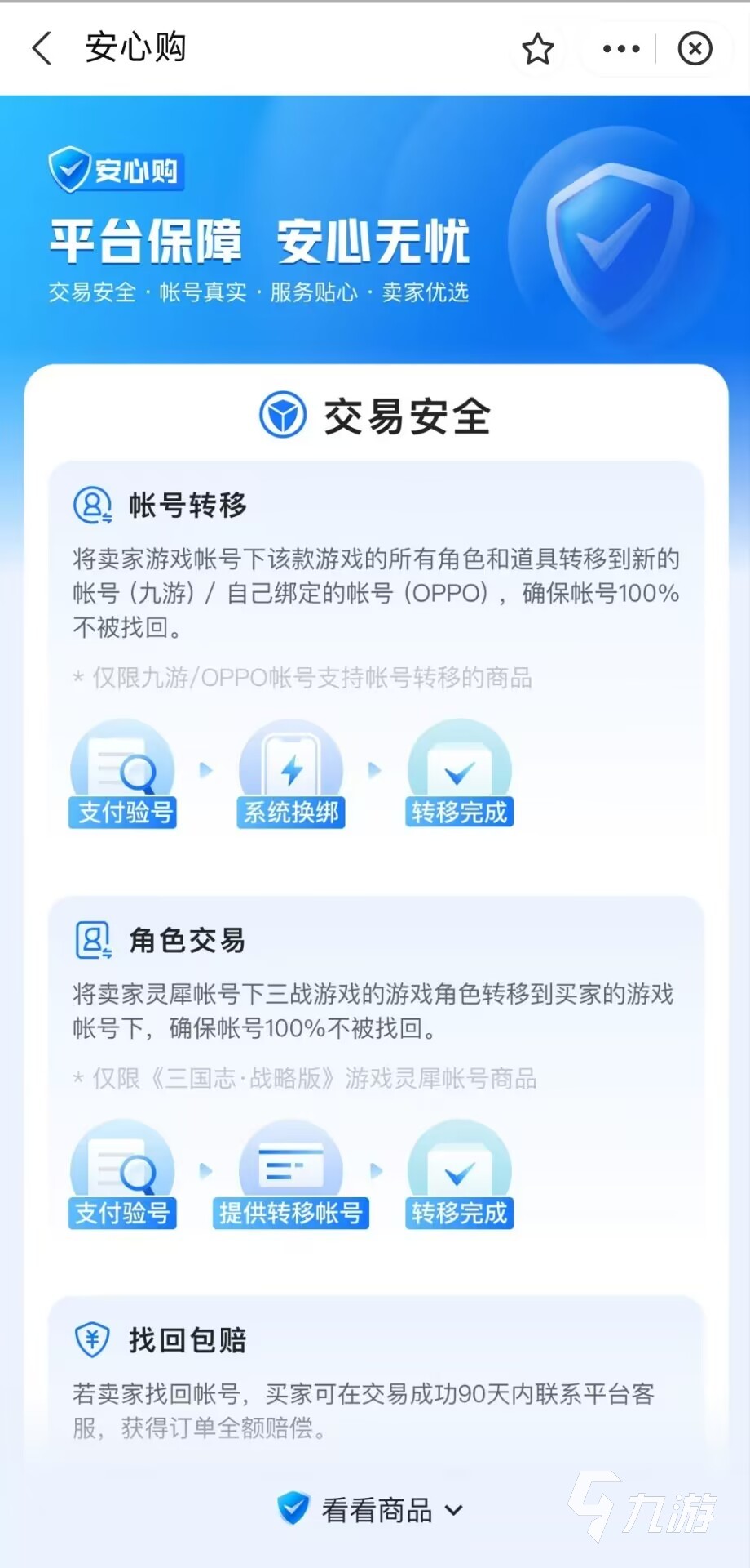 交易平臺(tái)除了專門(mén)驗(yàn)號(hào)保證買(mǎi)家安全以外,它在每次交易時(shí)還會(huì)為買(mǎi)家提供安心購(gòu)?fù)扑]。在買(mǎi)了安心購(gòu)以后,對(duì)于部分商品交易貓會(huì)做到找回包賠并且會(huì)嚴(yán)查賣家,讓這些黑心商家無(wú)路可走,同時(shí)一些商品在購(gòu)買(mǎi)時(shí)賣家也會(huì)免費(fèi)提供安心購(gòu),讓買(mǎi)家買(mǎi)的放心、買(mǎi)的安心。