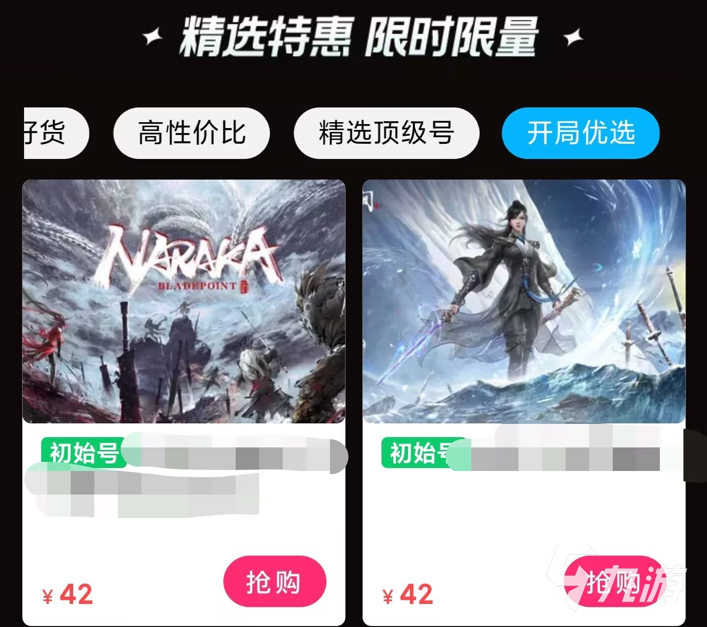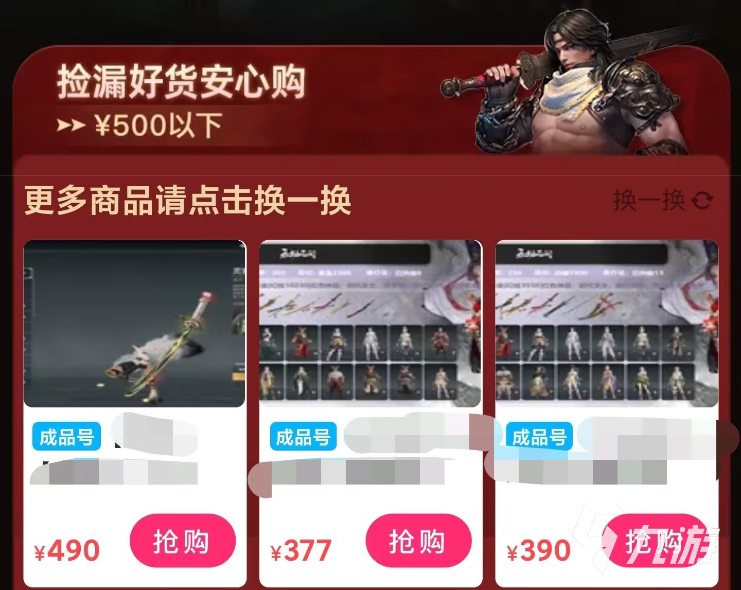 當然有的用戶只想有一款永劫無間就夠了,那么就可以向下滑動找到100元左右的優(yōu)惠專區(qū),都是幫助玩家們度過了新手教程,而且有很多金色皮膚的賬號,購買這些也是可以享受安心購服務的,不用擔心被找回的問題。
