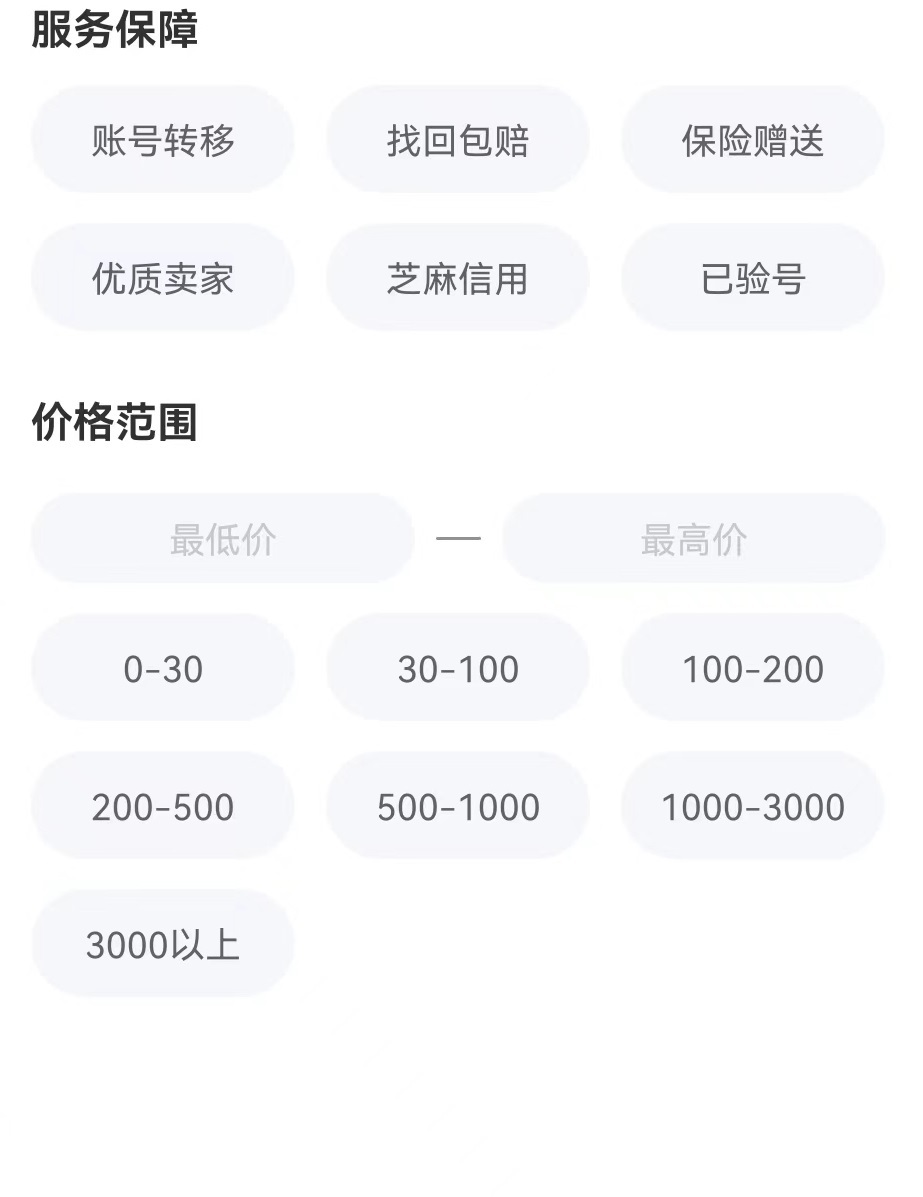 在交易貓中不僅賬號數量多,而且篩選功能做得非常到位,這樣在海量的商品中也能夠輕松找到自己需要的那一個??梢赃M行服務保障和價格范圍的篩選,服務保障包括有是否能進行賬號轉移,是否可以找回包賠以及買家的芝麻信用和優(yōu)質賣家等。這樣的篩選可以最大限度的保證找到最優(yōu)質的賣家,進而降低交易可能出現的風險。而價格篩選就是根據預算和實際需求找出合適的一部分。