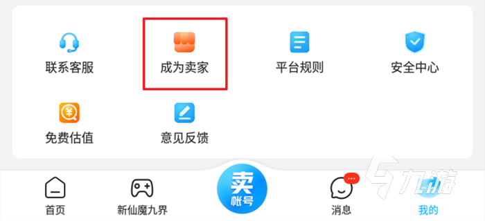 大家打開軟件,在我的界面中可以看到一些功能入口。這里大家比較需要的就是“成為賣家”了,這也是想要賣號前期需要的準備工作。當然了,這里還有其他的功能,比如對于新手用戶而言,在這里閱讀平臺規(guī)則是非常有必要的,能夠帶給我們很多的交易常識。如果有不懂的地方,也請在這里聯(lián)系客服,他們會幫助我們解答,并且協(xié)助我們解決一些問題。在安全中心內我們可以驗證客服身份,還能夠對違規(guī)的行為進行檢舉。