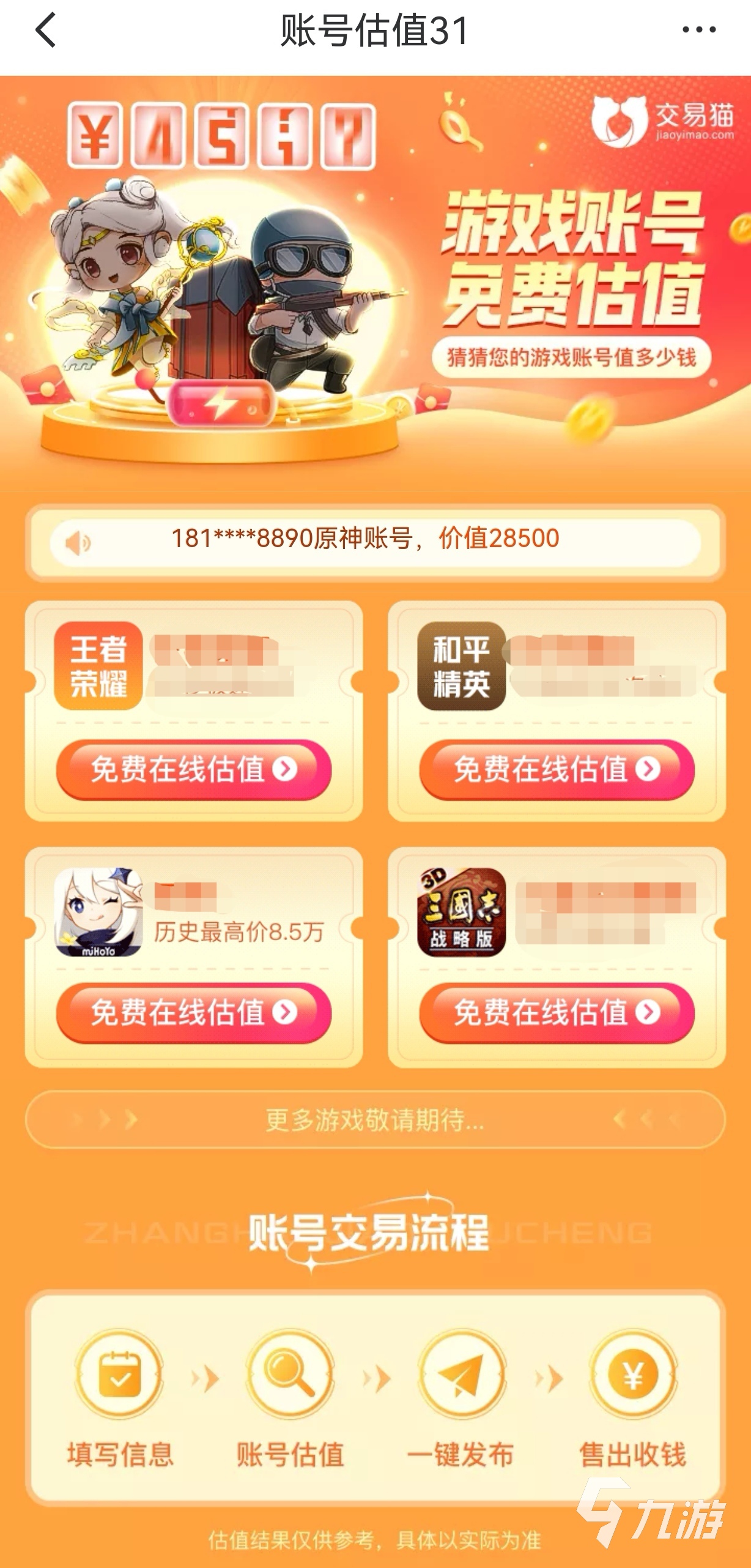 交易貓可以為玩家根據(jù)對應(yīng)賬號的資源進(jìn)行估價,首先玩家需要根據(jù)賣號的步驟操作下去,上傳好賬號內(nèi)的值錢的資源道具,以及自己培養(yǎng)的角色裝備等,再填寫好賣家的信息,當(dāng)這些都依次做完后就可以輸入游戲賬號密碼了,并填上商品售價,就可以開始免費估價了。