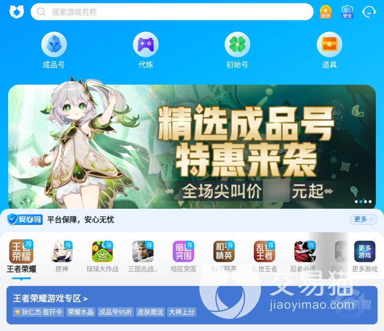 交易貓為當下熱門的游戲推出了專屬的區(qū)域,在主頁你可以看到王者榮耀游戲的專區(qū),這里有很多的選項,比如初始號,成品號,自抽號,另外還有代練以及各種裝備和道具等。這樣一看足以說明交易貓資源相當豐富,不只有游戲賬號這一種選擇,而其他的小平臺選擇就比較單一,對比之下交易貓的服務更加的方便快捷且多樣化。