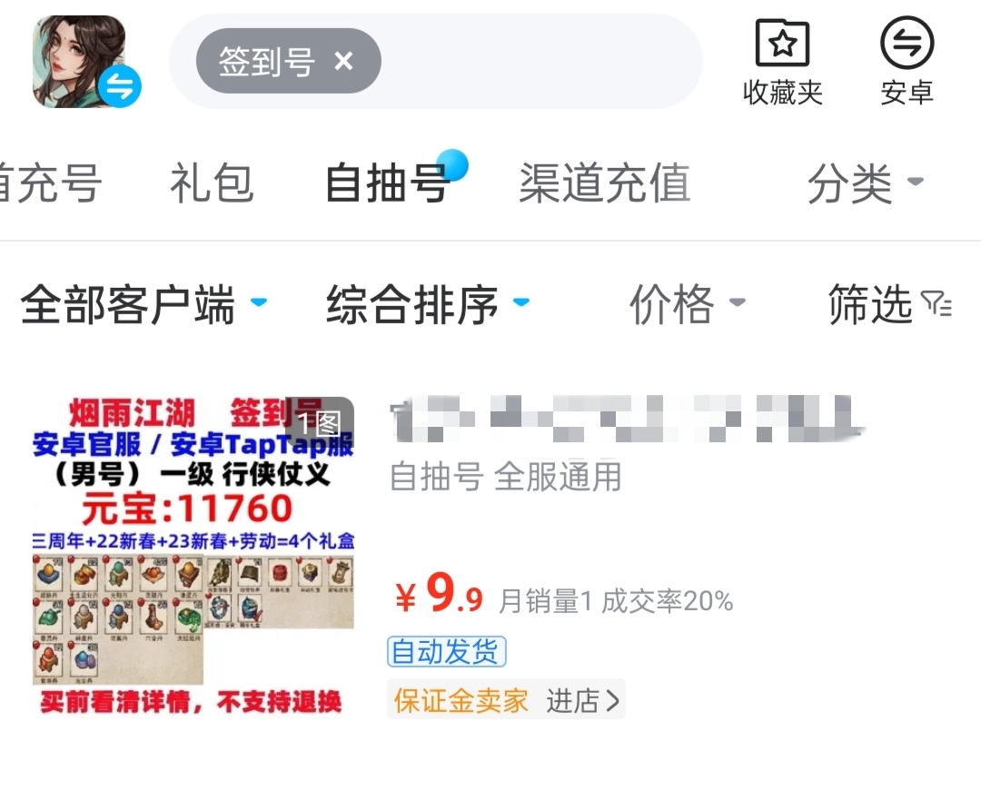 大家在交易貓中找到煙雨江湖專區(qū)并搜索“簽到號(hào)”或者自抽號(hào)、初始號(hào)就能找到與之相關(guān)的商品。通常簽到號(hào)都是大批量出售的,所以價(jià)格區(qū)間也不會(huì)太多,以煙雨江湖為例,老區(qū)的簽到號(hào)價(jià)格一般是在50~200之間,不會(huì)太貴,具體要看賬號(hào)里的東西。