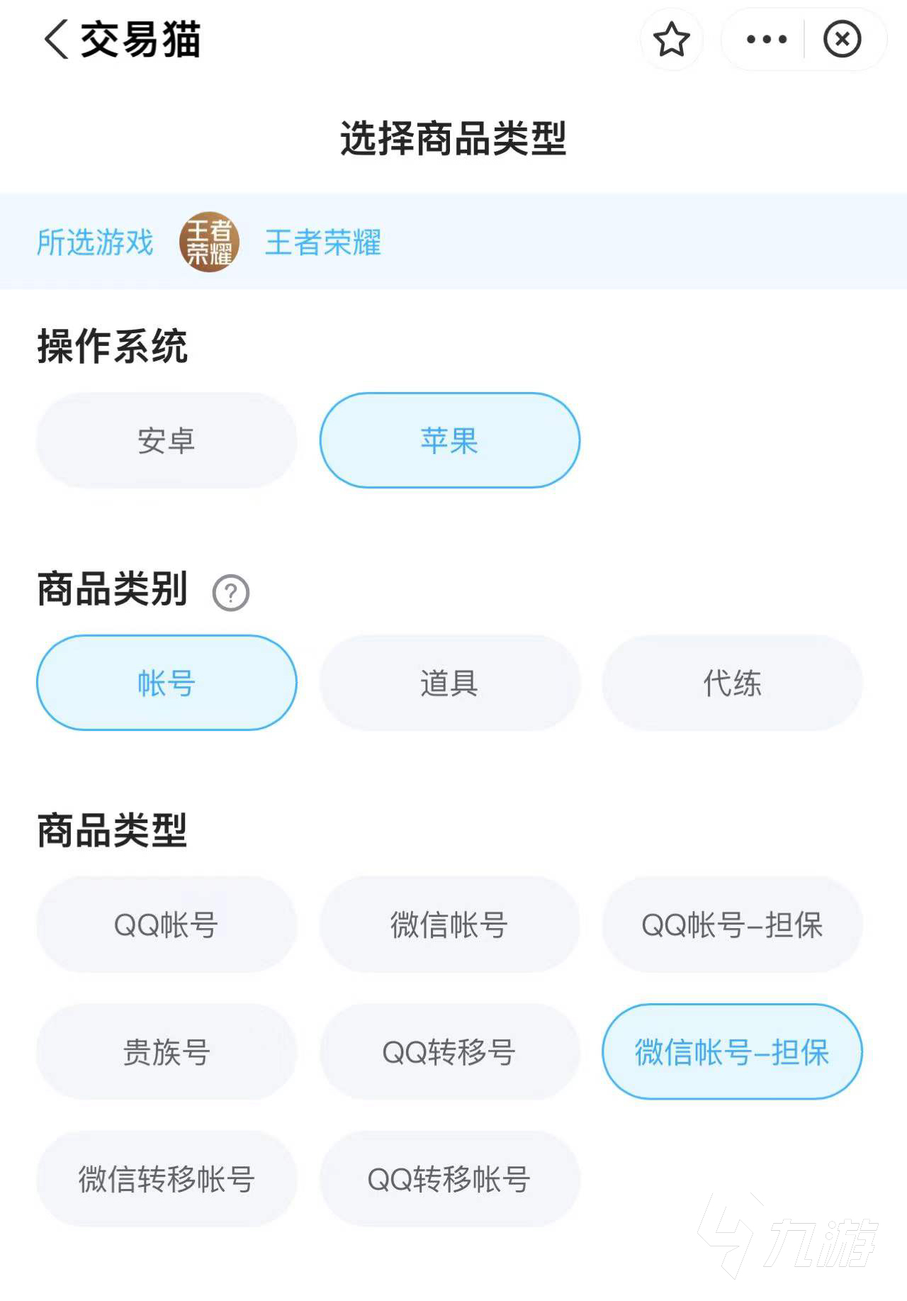 賣(mài)微信區(qū)的賬號(hào)需要點(diǎn)擊商品類型中的賬號(hào),之后會(huì)跳出一些選項(xiàng),這里大家點(diǎn)擊微信賬號(hào)或者微信轉(zhuǎn)移賬號(hào)即可,兩者之間都可以用來(lái)賣(mài)王者榮耀微信區(qū)的賬號(hào)。另外還有擔(dān)保功能,可以確保你的信譽(yù)是值得信任的,不過(guò)需要驗(yàn)證,但是可以提升你的成交率,之后點(diǎn)擊下一個(gè)填好相關(guān)信息即可賣(mài)號(hào)了。