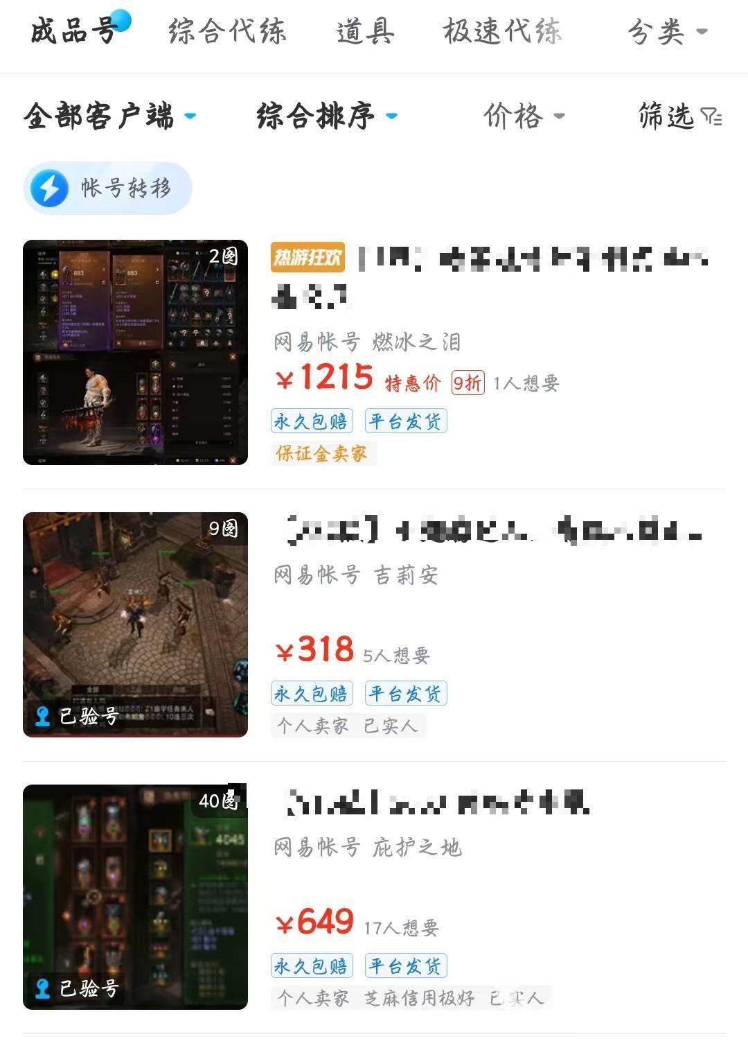 玩家下好交易貓之后,可以直接在平臺里輸入暗黑破壞神不朽游戲的名字,之后就會出現(xiàn)游戲的一些賬號信息,比如成品號,代練渠道,道具資源等等,在這里都有。并且玩家也能看出來根據(jù)暗黑破壞神不朽游戲賬號等級和物品的不同,他們的價格也是不同的,所以不管玩家想要什么價格區(qū)間的賬號,基本上都能找到。