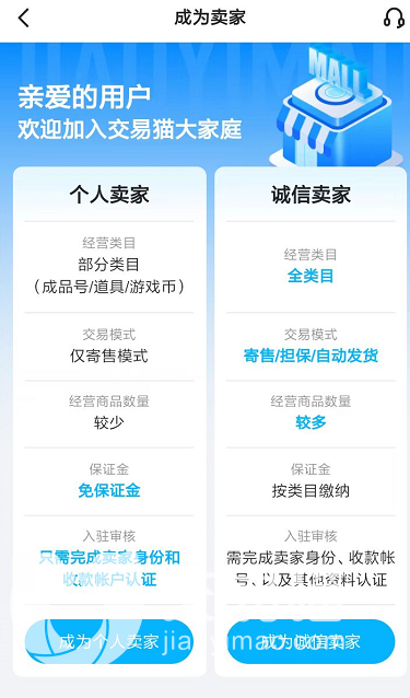 2、如果你是準(zhǔn)備在交易貓app當(dāng)中成為一個優(yōu)質(zhì)賣家的話,那么可以進(jìn)入到個人中心頁面開啟誠信賣家的申請。整個過程需要驗證玩家們的各種信用分和綁定相關(guān)的app來讓平臺進(jìn)行審核。一旦成為了誠信賣家之后,各位就可以經(jīng)營更多類型的商品,同時自己的成交概率也會變得更高。