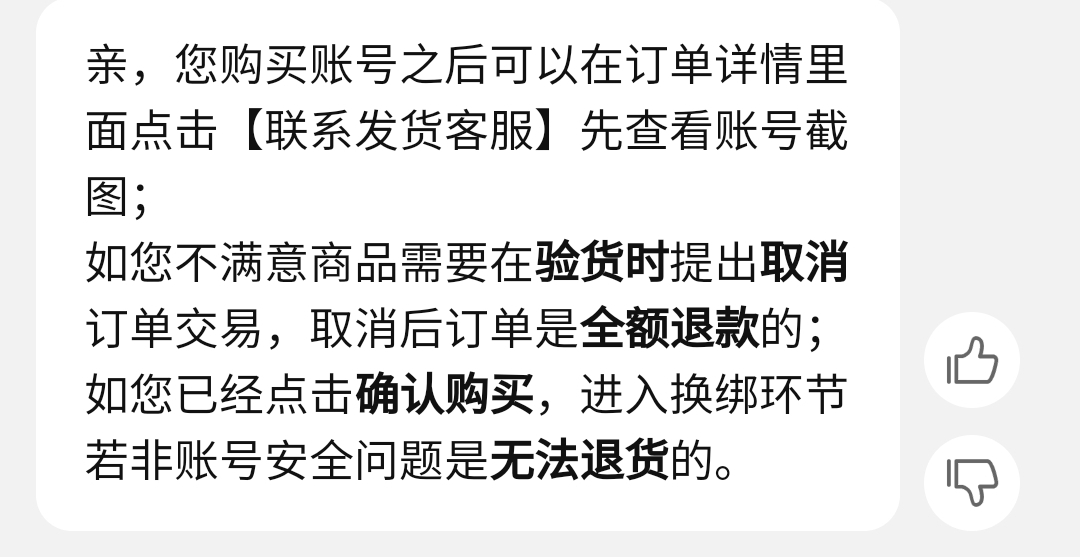 交易成功后,一旦過了訂單保護(hù)期,賬號是不支持無理由退換的。在賬號保護(hù)期內(nèi),除非賬號有與介紹不符的情況,或是后續(xù)使用過程中被凍結(jié)、找回等等,平臺才會介入處理。