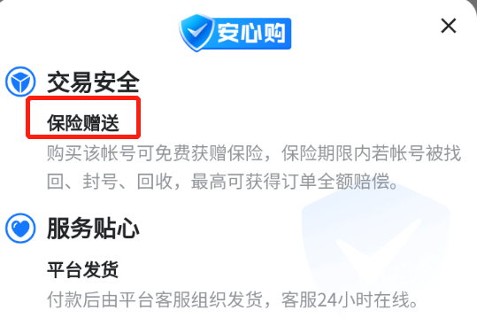 平臺(tái)中的“安心購(gòu)”服務(wù)是一大特色,而其中對(duì)于部分商品的安心購(gòu)會(huì)添置獨(dú)有的“保險(xiǎn)贈(zèng)送”服務(wù),這個(gè)服務(wù)是不需要您額外支付費(fèi)用的,等于買號(hào)的時(shí)候就能免費(fèi)獲取一個(gè)保險(xiǎn),保險(xiǎn)會(huì)在賬號(hào)出現(xiàn)異常,或賬號(hào)被找回時(shí)提供相應(yīng)補(bǔ)償,當(dāng)然,這個(gè)補(bǔ)償需要在客服那邊進(jìn)行申請(qǐng)核驗(yàn),不過大家放心,平臺(tái)的客服效率還是很高的。