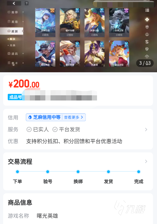 目前這個游戲主要的價值除了英雄和皮膚外,更多還體現(xiàn)在銘文,排位段位,殿堂騎士和玩家的等級上面,其中銘文能提升英雄額外屬性,讓你在游戲里占據(jù)先機,段位和殿堂能讓你更有面子,等級則是能解鎖更多功能。上述這些條件都滿足的話,賬號的價值就會得到質(zhì)的飛躍,以下“交易貓”里的商品列表,順序按價格升序排列,大家可以看到,僅僅是倒數(shù)第三便宜的賬號就已經(jīng)能夠賣到三位數(shù)。