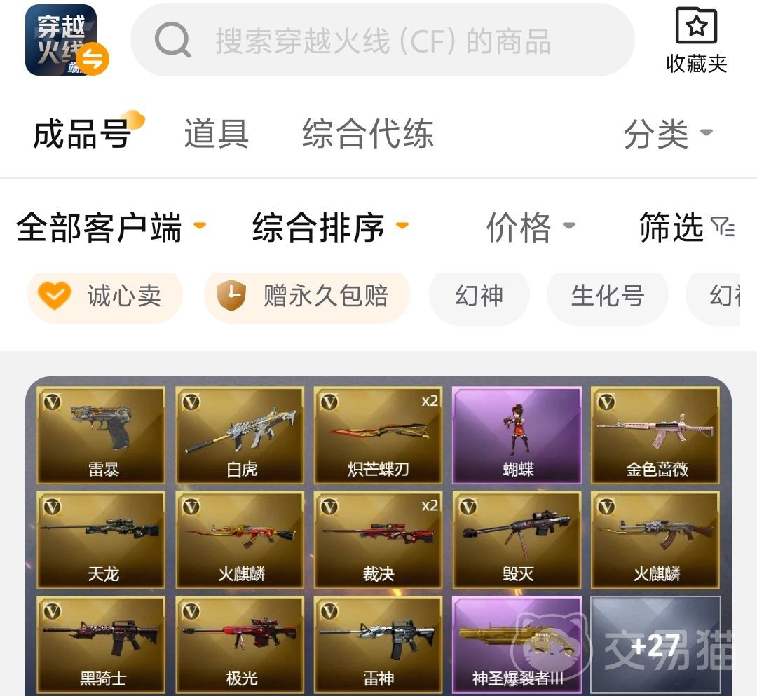 Android用戶不用去搜索下載,直接點(diǎn)擊上方按鈕即可安裝安裝交易貓app,iOS用戶可以前往官網(wǎng)進(jìn)行賬號的買賣交易。Cf端游目前在平臺內(nèi)推出了多至尊多王者的武器靚號,即使是很久沒玩不認(rèn)識里面的角色和武器外形,在官方的驗號報告中也會有小縮略圖的形式為大家呈現(xiàn)武器圖片和名稱還有數(shù)量等關(guān)鍵信息,方便玩家更快的判斷賬號是否劃算;而對賣家來講正好可以用平臺的估價功能。