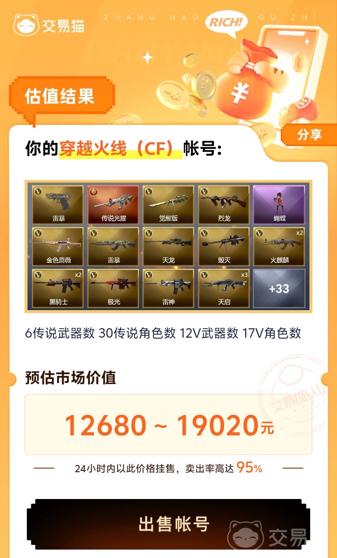 來源: 極光 作者: 澈 2024年12月04日 21:11很多愛打穿越的玩家可能在對年輕的時候把游戲里推出的所有神器全買了個遍,甚至到后面需要通過抽獎才能獲得的神器也都硬著頭皮氪了出來。很多玩家想知道cf賬號估價平臺推薦哪個呢,沒時間玩多少會萌生一點(diǎn)賣號的想法,但是確實(shí)想而且也應(yīng)該先看看整體的價值是多少,感覺自己能接受就可以掛在交易貓上出售,而今天給大家推薦的平臺正好也有估價功能,一起來看看吧。