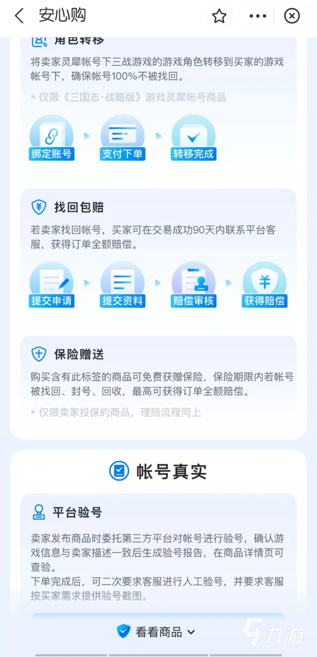 另外,有一些玩家或許會(huì)擔(dān)心,付了錢以后萬一賣家通過一些方式找回游戲賬號(hào)了怎么辦,這個(gè)也是不用擔(dān)心的;交易貓平臺(tái)在賣家上架商品的時(shí)候,都會(huì)要求實(shí)名認(rèn)證,所以出現(xiàn)這種情況是很少數(shù)的;就算有玩家真的找回了賬號(hào),交易貓平臺(tái)還有找回包賠服務(wù),對(duì)買家的損失進(jìn)行賠償。