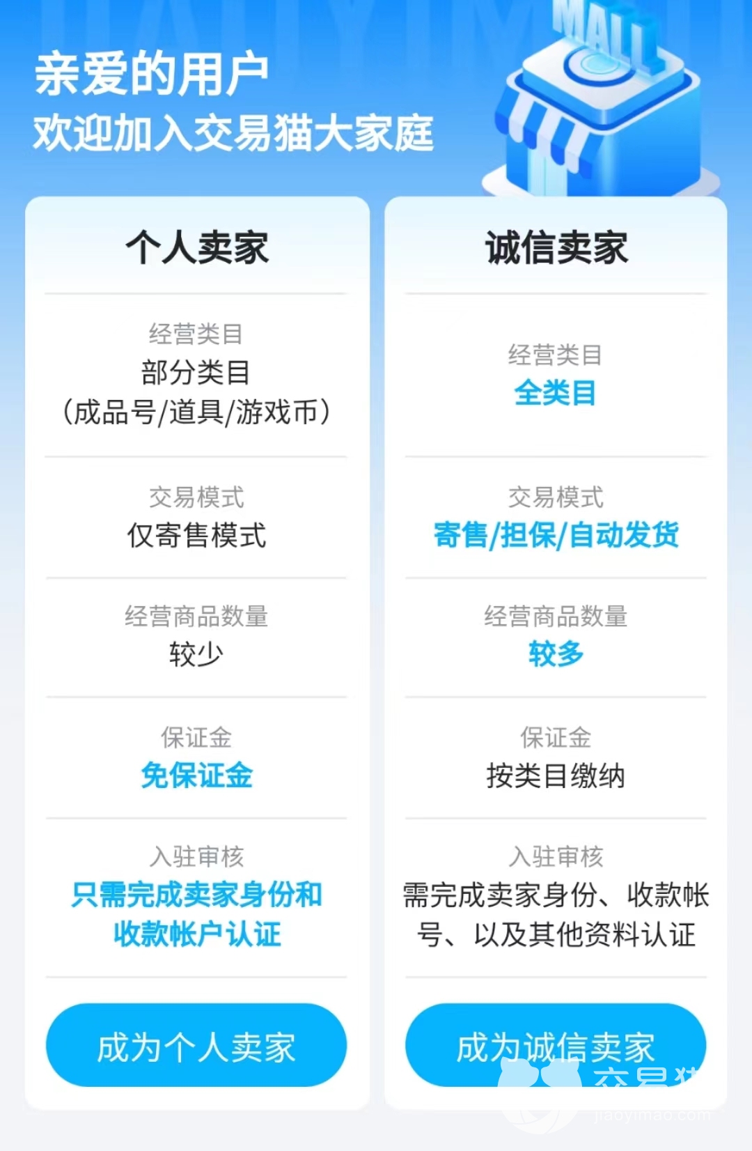 成為交易貓賣家特別簡(jiǎn)單,沒有門檻設(shè)置,哪怕是普通人也可以在上面開店賣游戲賬號(hào)。賣家身份分為個(gè)人賣家和誠(chéng)信賣家,不同身份的權(quán)限是不一樣的,個(gè)人賣家沒有保證金限制,出售的商品也有限。小編建議有條件的小伙伴繳納保證金當(dāng)誠(chéng)信賣家,這樣經(jīng)營(yíng)的范圍更廣,享受的權(quán)益也更多。
