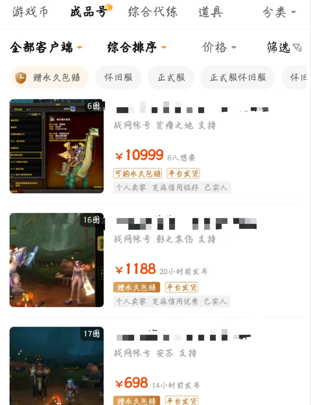 小伙伴們只要把自己想玩的游戲名稱進(jìn)行搜索就可以找到相應(yīng)的專區(qū)了,從下圖中小伙伴們可以看到,不僅僅是魔獸世界,像其他系列的懷舊服,妖王之怒以及外服的賬號資源都是有的,點(diǎn)進(jìn)之后大家也能看到有不少的資源,不僅有游戲號的售賣,還有各種道具可以選擇。