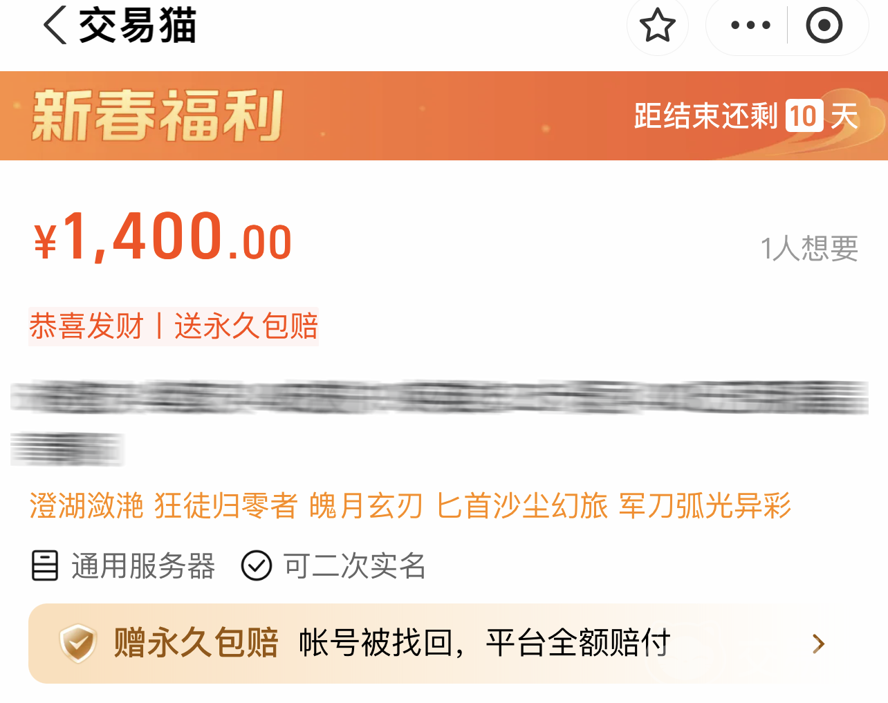 就算一個(gè)帳號(hào)多便宜,如果被找回或者出現(xiàn)安全上的問(wèn)題的話(huà),那也白搭。還好在交易貓內(nèi)有部分商品支持永久包賠服務(wù),如果被找回的話(huà)就可以獲得全額賠付,如果商品不支持的話(huà)也可以自己選購(gòu)一份。這樣更有安全保障,畢竟帳號(hào)是虛擬產(chǎn)品,只有在交易貓內(nèi)買(mǎi)號(hào),讓人更有安全感。