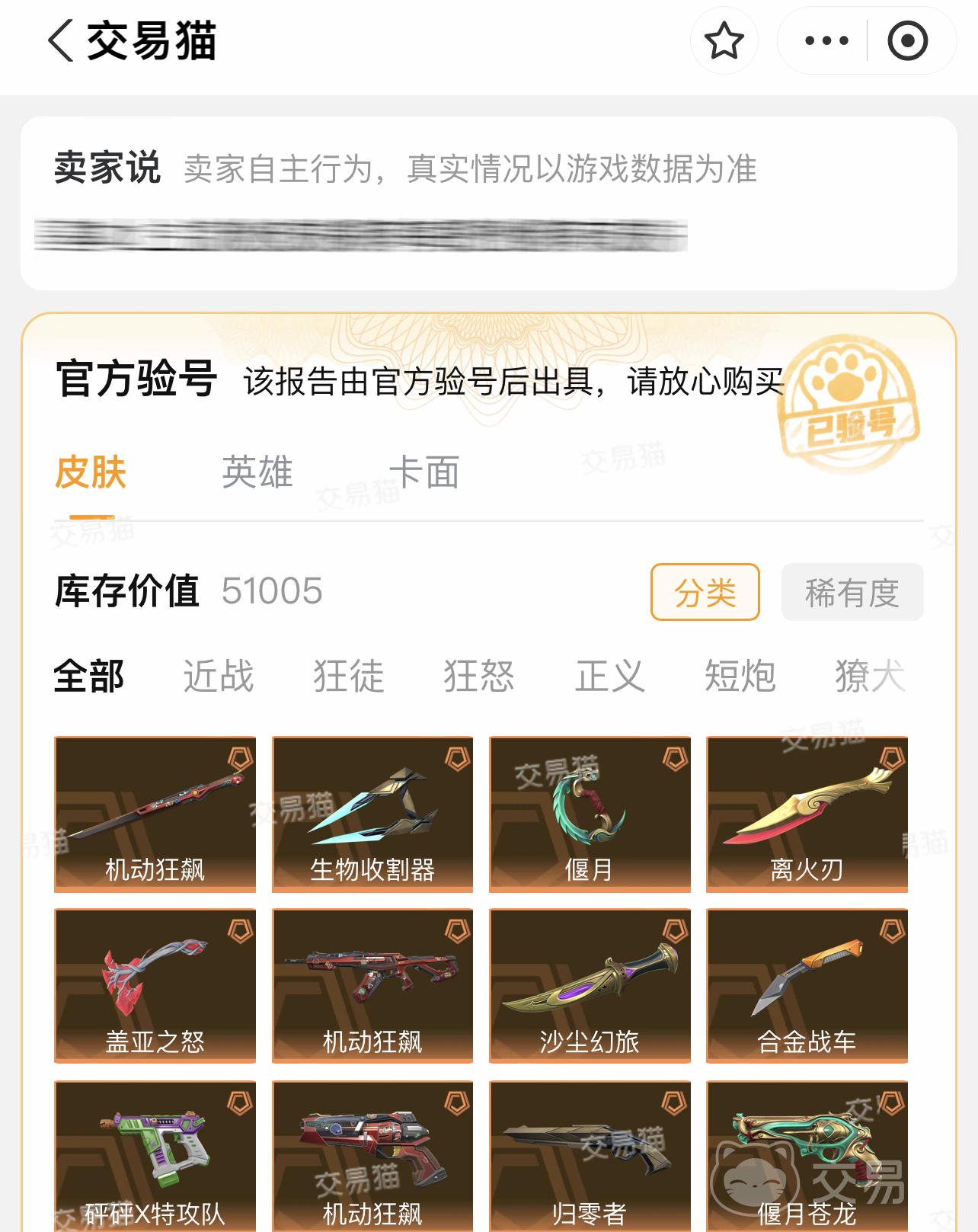 有的朋友擔(dān)心自己買(mǎi)的帳號(hào)跟商家描述的信息有出入,所以就不敢購(gòu)買(mǎi)。這時(shí)候可選擇交易貓內(nèi)支持平臺(tái)驗(yàn)貨的商品,然后就會(huì)通過(guò)交易貓官方嚴(yán)格的審核。如此一來(lái),你就可以查看該商品內(nèi)有哪些道具以及皮膚,還有其他信息,都能夠保真。