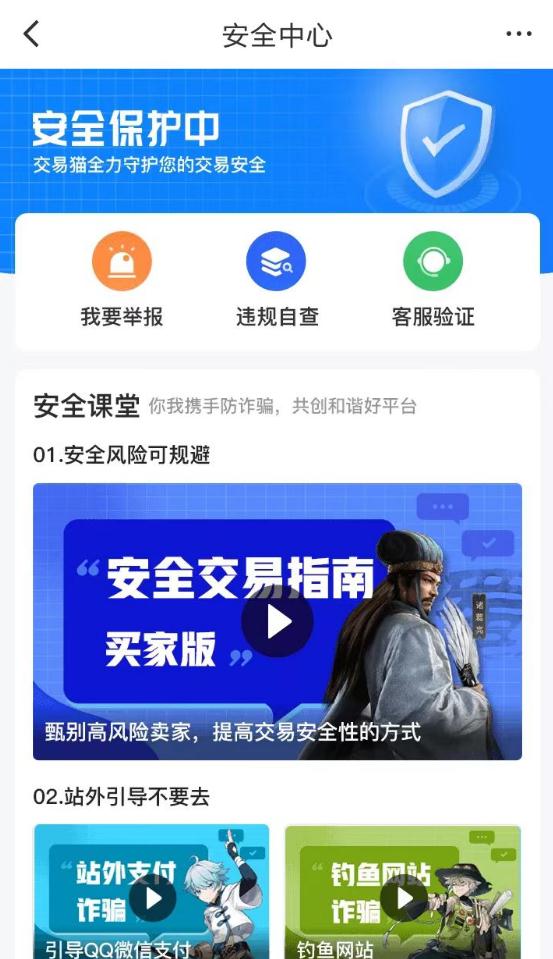 3、安全保護(hù)機(jī)制,還可以讓玩家們從此告別遇到各種虛假交易信息。大家同時(shí)還可以進(jìn)入到安全中心當(dāng)中,舉報(bào)那些違規(guī)商品或者各種不符合描述的商品,平臺(tái)也會(huì)在短時(shí)間內(nèi)幫助玩家們進(jìn)行處理。同時(shí)也會(huì)讓更多交易貓用戶參與到維護(hù)綠色交易的行動(dòng)當(dāng)中去。