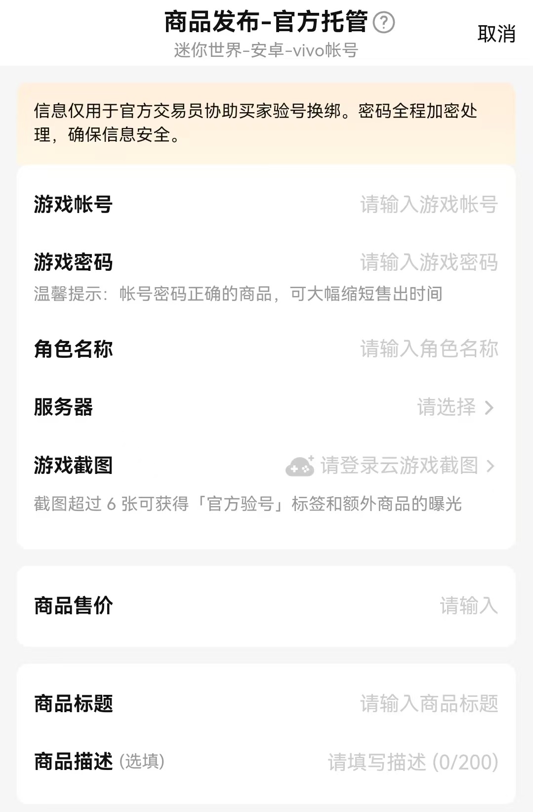 先來介紹一下在交易貓中如何進行賬號出售,首先打開app之后選擇賣號,在這里直接輸入需要的游戲名,就可以找到出售對應(yīng)的商品的頁面了。選擇好類別繼續(xù)往下點擊選擇,就到了填寫關(guān)鍵信息地方。對于這款游戲,平臺推出了官方托管功能,官方托管優(yōu)勢是由專業(yè)交易員幫助賬號進行信息和截圖,這樣就無需進行過多的操作,買家下單之后也不需要再進行驗號,官方交易員就直接幫助進行綁定更換了。大家只需要坐等收款就可以,所以選擇交易貓來出售這款游戲,可以大大節(jié)省時間和精力。