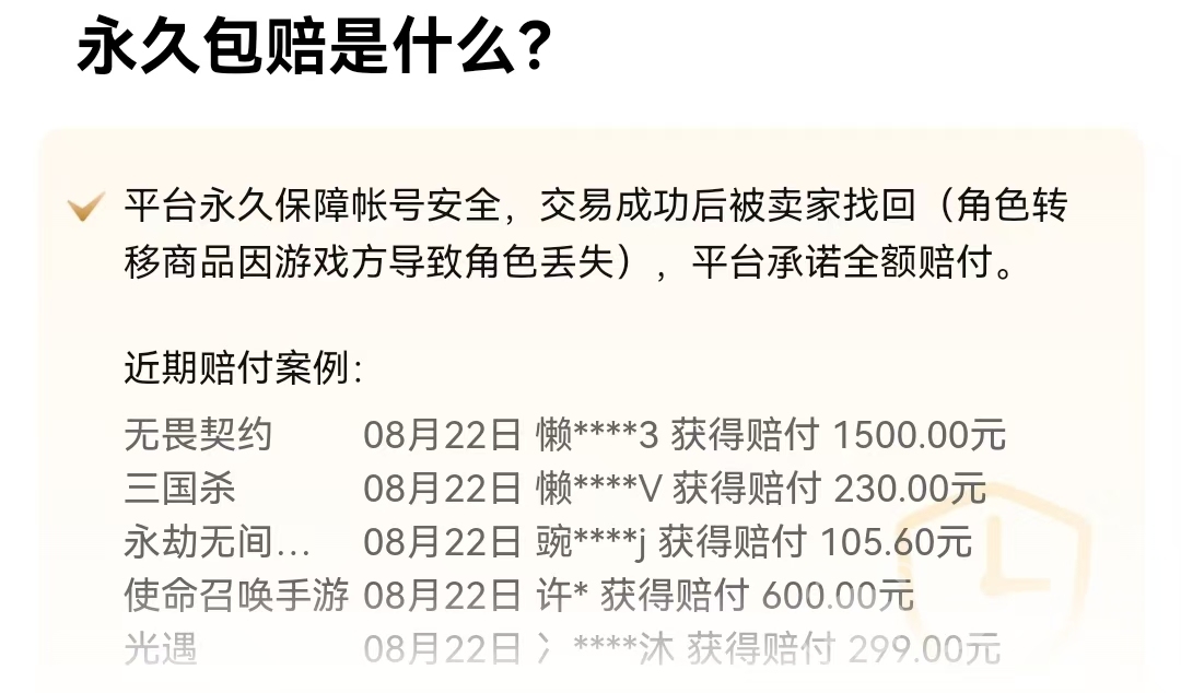 在交易完成之后,很多玩家仍然關(guān)注售后問題,特別是賬號(hào)后續(xù)的安全保障。交易貓針對(duì)這一需求,推出了獨(dú)特的永久保障服務(wù),為買家提供長(zhǎng)效的安全保障。在購(gòu)買賬號(hào)后,玩家可以選擇額外的安全保險(xiǎn),以防止賬號(hào)因各種不可控因素而發(fā)生變動(dòng)。如果賬號(hào)在交易后遭遇異常情況,買家可以向平臺(tái)申請(qǐng)售后支持,交易貓會(huì)依據(jù)具體情況提供相應(yīng)的解決方案。這一機(jī)制有效降低了交易風(fēng)險(xiǎn),確保玩家能夠安心使用購(gòu)買的賬號(hào),而不必?fù)?dān)心后續(xù)問題。