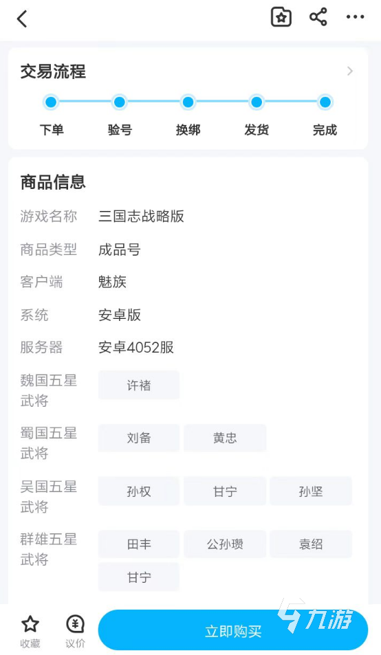 2、當然,大家在查看商品的時候,最好還是進入商詳頁當中去了解游戲號內(nèi)所包含了哪些武將。部分高級武將的出現(xiàn),會讓游戲號的性價比變得更高,小編也建議各位優(yōu)先去購買這一類型的游戲號。