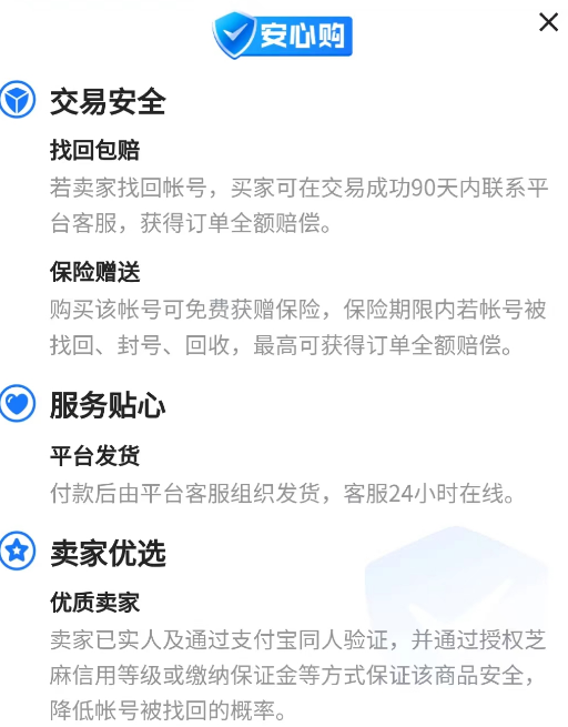 交易貓比較有特色的一點就是保險服務,除了大家能在商品結算頁面中購買的額外保險之外,交易貓部分商品還有贈送的免費安心購,安心購是無需買家支付費用就能獲得的,不同安心購所提供的服務不同,最為常見的就是找回包賠和平臺發(fā)貨,能大大降低賬號被找回的可能性。