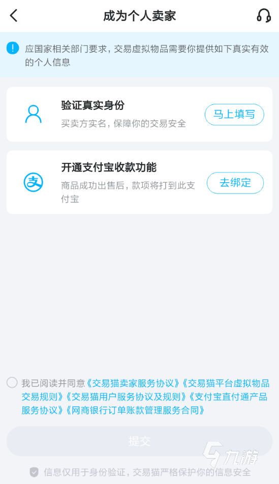 1、想要在交易貓當(dāng)中發(fā)布交易信息的話其實(shí)很簡單,各位只需要去開通一個個人賣家身份的認(rèn)證即可,根據(jù)系統(tǒng)的提示去進(jìn)行身份驗(yàn)證,然后在開通相關(guān)的支付功能,接下來玩家們就可以在平臺當(dāng)中自由發(fā)布想要進(jìn)行交易的商品了。