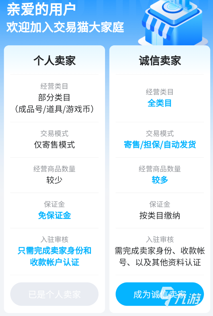 1.對(duì)于優(yōu)質(zhì)賣家,開放升級(jí)渠道,用戶們可以通過(guò)完善資料、提供保證金等方式,成為平臺(tái)的誠(chéng)信賣家,針對(duì)誠(chéng)信賣家,平臺(tái)開放更多賣號(hào)渠道,首先是經(jīng)營(yíng)類目,會(huì)由原本有限的類目變成全類目,同時(shí)支持寄售、擔(dān)保以及自動(dòng)發(fā)貨共三種交易模式,可經(jīng)營(yíng)的商品數(shù)量也會(huì)提高??偠灾?,平臺(tái)對(duì)于優(yōu)質(zhì)賣家的扶持力度很大,小伙伴們感興趣的話可以了解了解。
