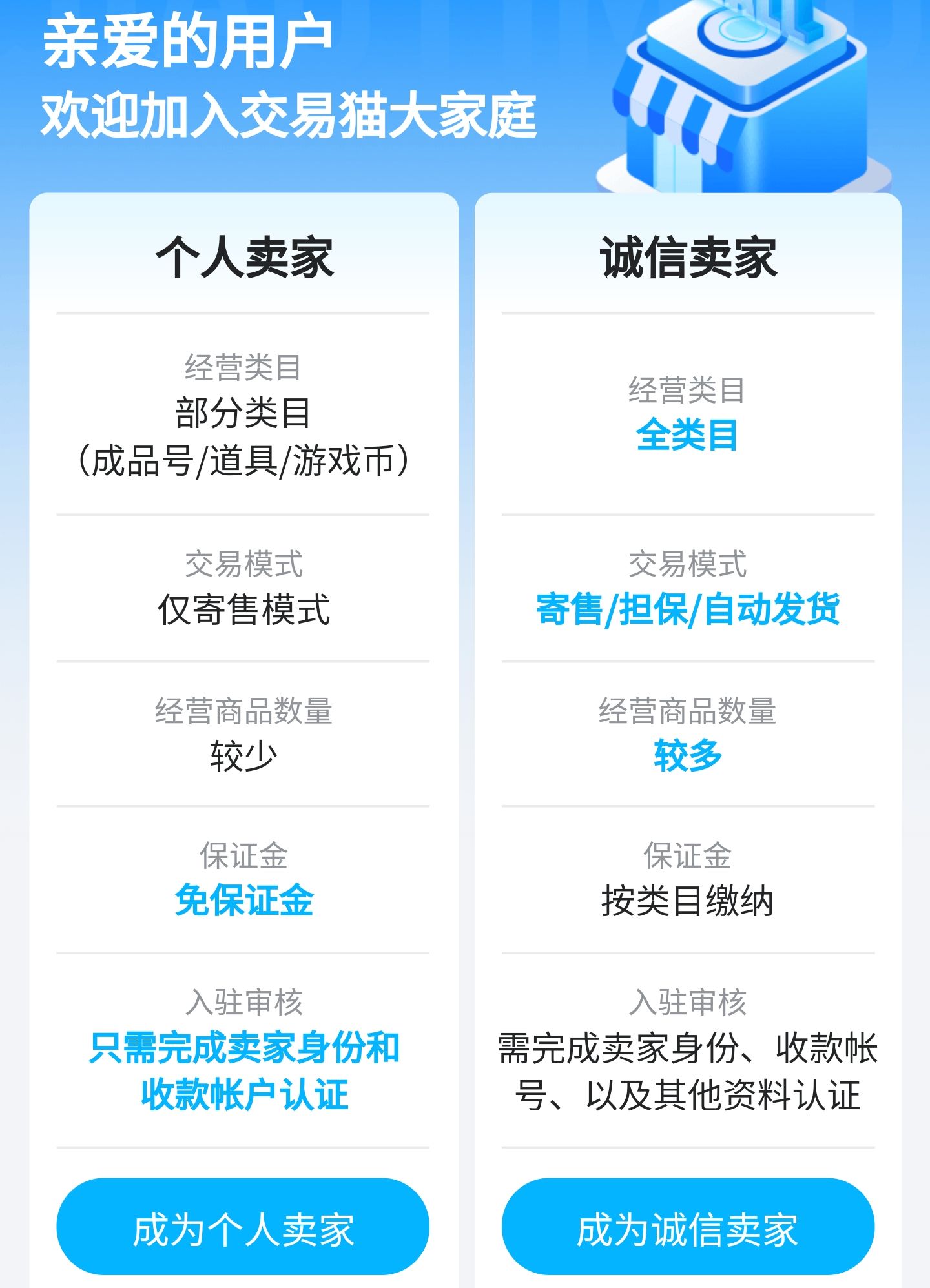 在收到一個合適的報價之后,也不需要特別繁瑣的上架步驟,直接點擊一鍵轉(zhuǎn)賣就可以。當然前提是大家需要認證成為平臺的個人賣家,那么許多游戲類的商人和工作室想要出售開局號和自抽號該怎么做呢,交易貓也為大家考慮到了這一點,為了給買家?guī)砜梢允酆蟮膿?,所以必須要繳納保證金與平臺簽約才可以成為這種售賣除成品號之外類目的商品。