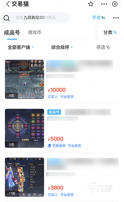 成品游戲賬號一籮筐。在九陰真經(jīng)專區(qū)中,玩家們搜尋到海量大神號。它們擁有不同職業(yè)、角色等級、門派、功力、外觀造型等。買家們按照個人偏好,低價撿漏賬號,快速選購到精品大神號。