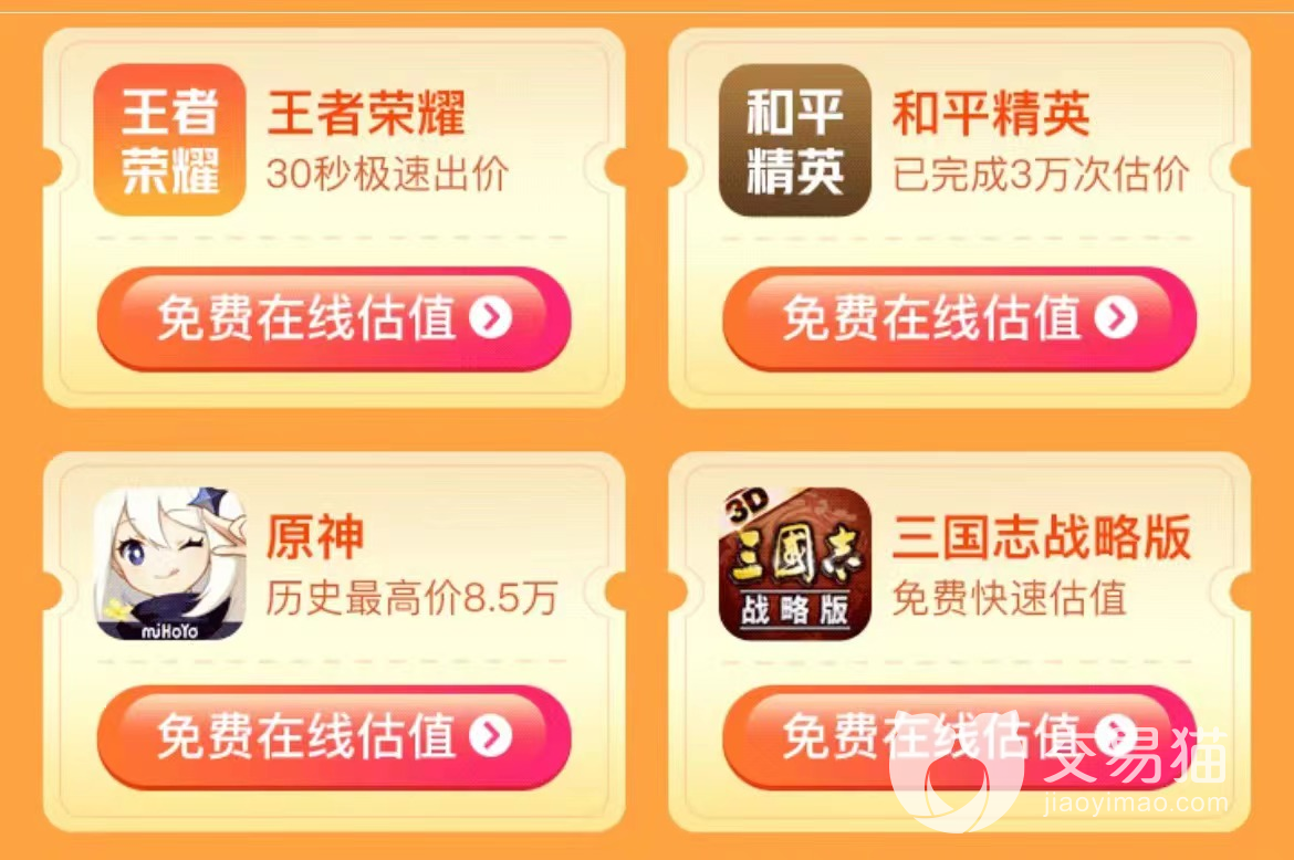 給原神賬號估價可以到交易貓平臺來,它的估值系統(tǒng)正好免費估值原神游戲賬號,除了原神以外還有其他三款游戲也支持免費估價。大家估價以后就能參考系統(tǒng)給出的結(jié)果來定價了,系統(tǒng)估值特別靠譜,不僅結(jié)合了市場的價格還結(jié)合賬號實際情況,這樣大家賣號的時候心中有數(shù)也不會虧錢或者標高了賣不出去。