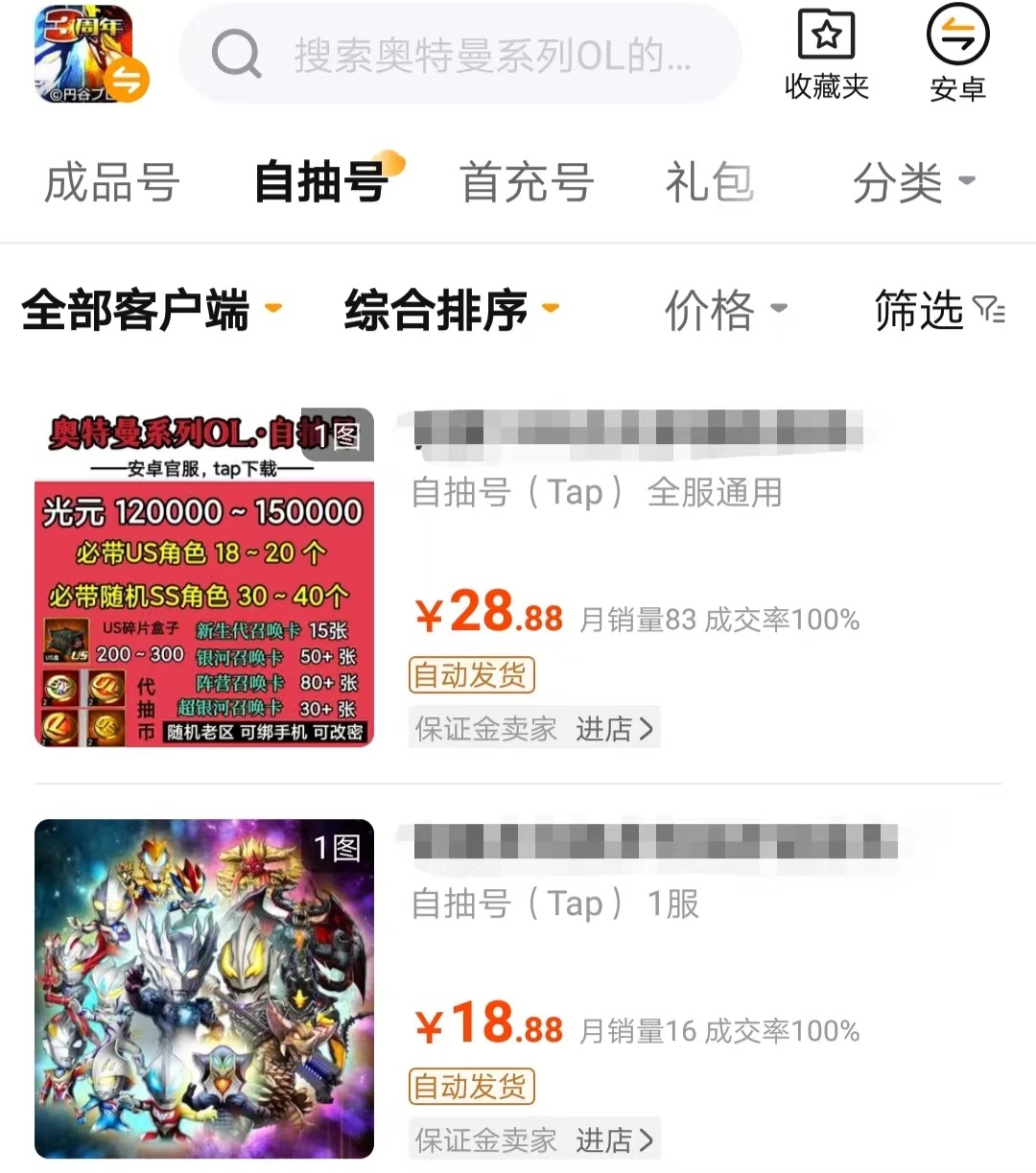 這個(gè)游戲在交易貓上擁有多個(gè)類型的游戲賬號(hào)內(nèi)容,如果說(shuō)玩家對(duì)于卡牌的搜索和賬號(hào)的培養(yǎng)有興趣的話,可以在交易貓上搜索自抽號(hào)或者是初始號(hào)進(jìn)行交易。自抽號(hào)基本上能夠讓玩家擁有多次的抽取次數(shù),可以讓玩家擁有很多的奧特曼角色卡牌。自抽號(hào)或者是初始號(hào)在交易貓上是保證金賣家在銷售,這類賣家的信譽(yù)有保障,可以放心購(gòu)買。