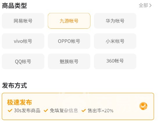 而談到賣號,很多人不想賣號一方面是處于自己培養(yǎng)起來的賬號有感情有朋友在,另一個方面是嫌麻煩。交易貓賣號就很方便,只需簡單點選就可以完成商品發(fā)布,如果是九游賬號,更是可以享受“極速發(fā)布”,30秒就可以將賬號發(fā)布,提升你的賬號售出率。