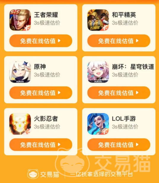推薦交易貓也是因?yàn)檫@個平臺具體專業(yè)的估值服務(wù),針對王者、原神這類游戲是能夠去進(jìn)行評估的,在對應(yīng)的界面中,大家可去直接選擇相關(guān)的游戲,然后去填寫信息,只需等待幾秒的時(shí)間,就能看到專業(yè)的報(bào)價(jià)了,這個還是比較權(quán)威的,大家不用擔(dān)心會出現(xiàn)確立的價(jià)格存在問題。安卓用戶點(diǎn)擊上方鏈接去下載客戶端,IOS用戶前往交易貓官網(wǎng)交易即可。