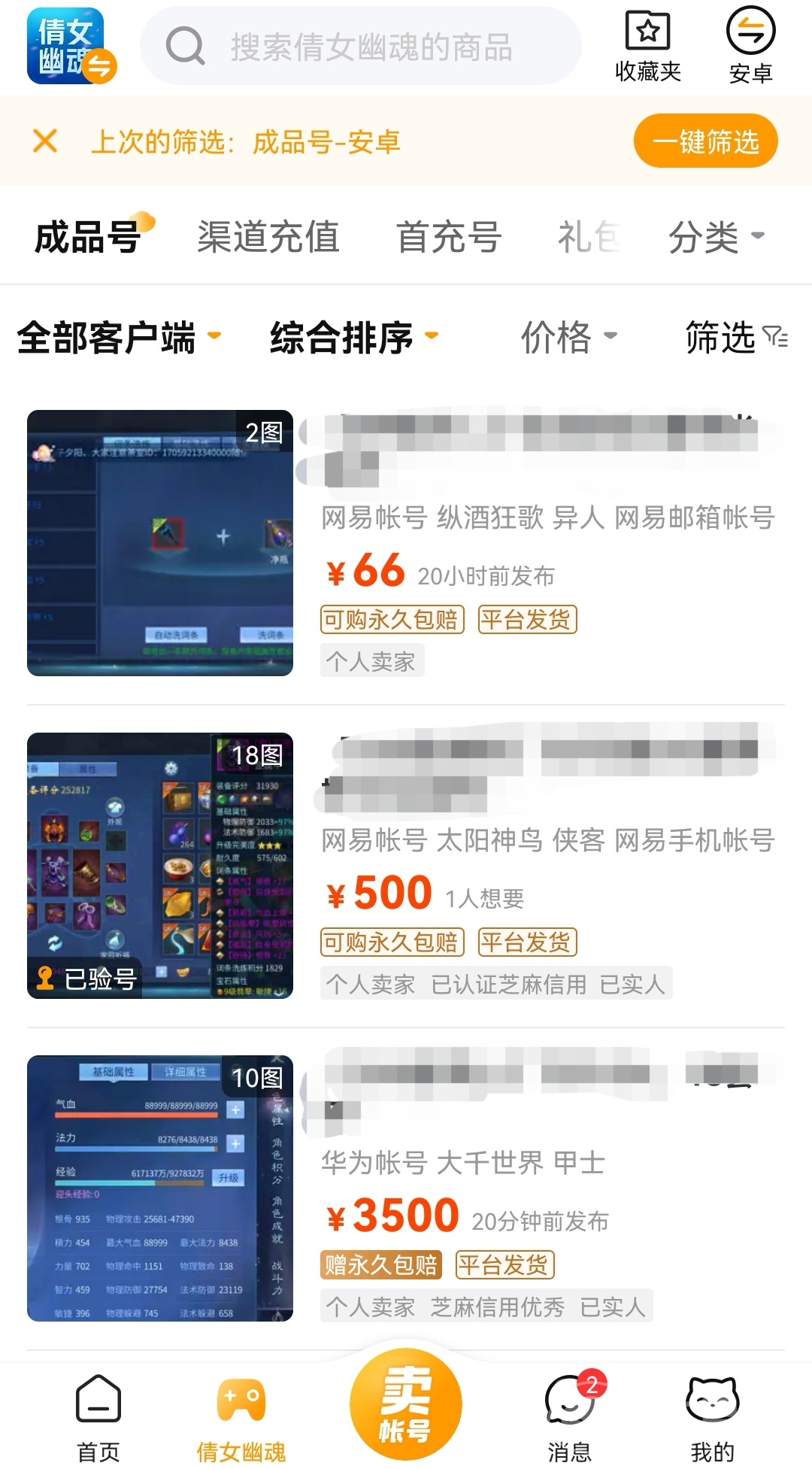 只要有購買游戲賬號需求的小伙伴就直接到交易貓當中搜索對應的游戲?qū)^(qū),比如倩女幽魂,在進入專區(qū)之后就可以去瀏覽各種賬號商品鏈接了,比如老區(qū)賬號就可以搜索捷達,利用旁邊的篩選按鈕快速定位到你想要的賬號類型,利用詳細信息進行全方位了解查看。