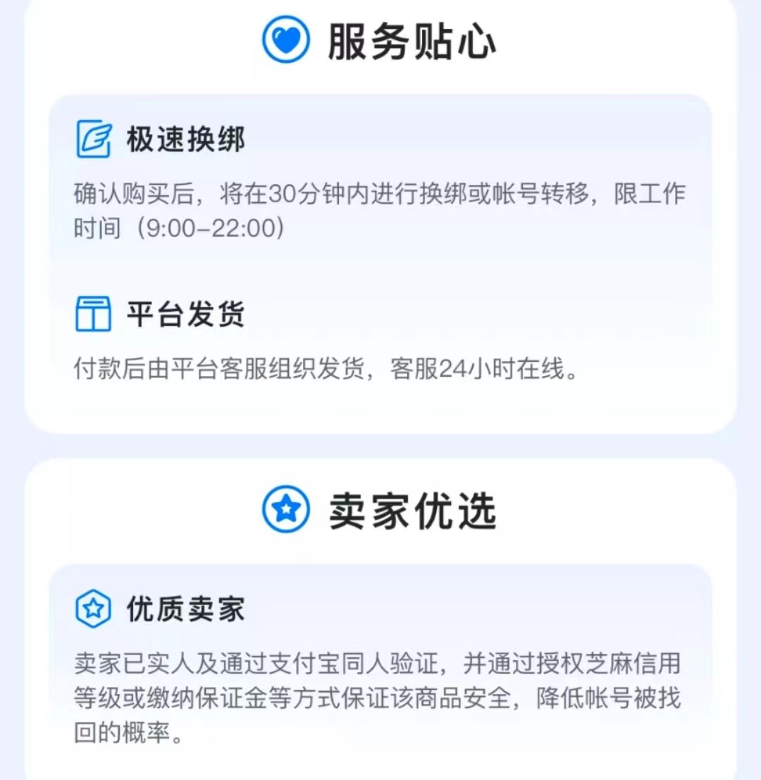 在選擇商品的時候,小編建議大家可以選擇有優(yōu)質賣家稱號的商品,因為這樣的稱號需要授權芝麻信用或者繳納保證金來保證商品的安全,也可以降低賬號被找回的概率,所以在安全性方面也更有保障。