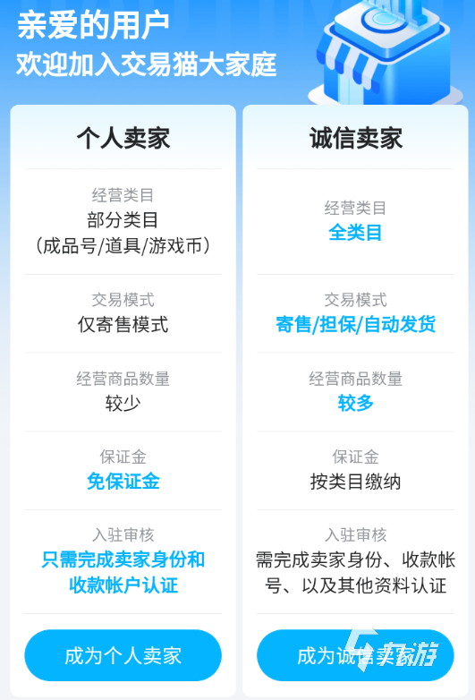 好了,關(guān)于“圣劍聯(lián)盟賣號平臺用哪個”的內(nèi)容到這里就結(jié)束了,相信對于用什么平臺大家看完后心里應該已經(jīng)有答案了,選擇“交易貓”的話不僅行情好,賬號易售出,而且申請成為賣家的流程也十分便捷,所以大家趕緊點擊前文鏈接下載吧!